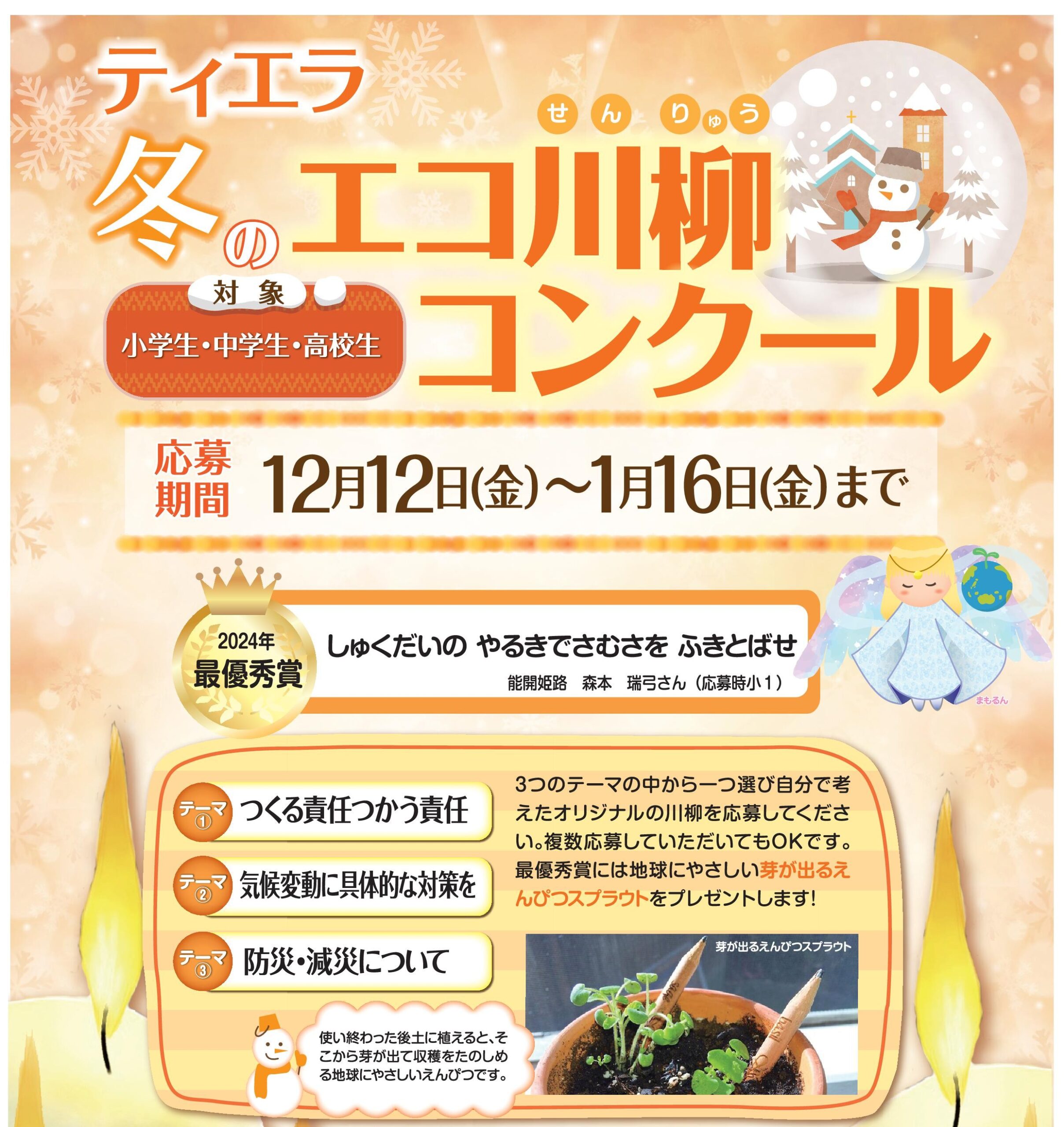 冬のクール・ティエラ運動では、子どもたちが環境について気づいたこと、感じたことを五七五で表現する「ティエラエコ川柳コンクール」を毎年開催しています。たくさんの応募お待ちしております!!